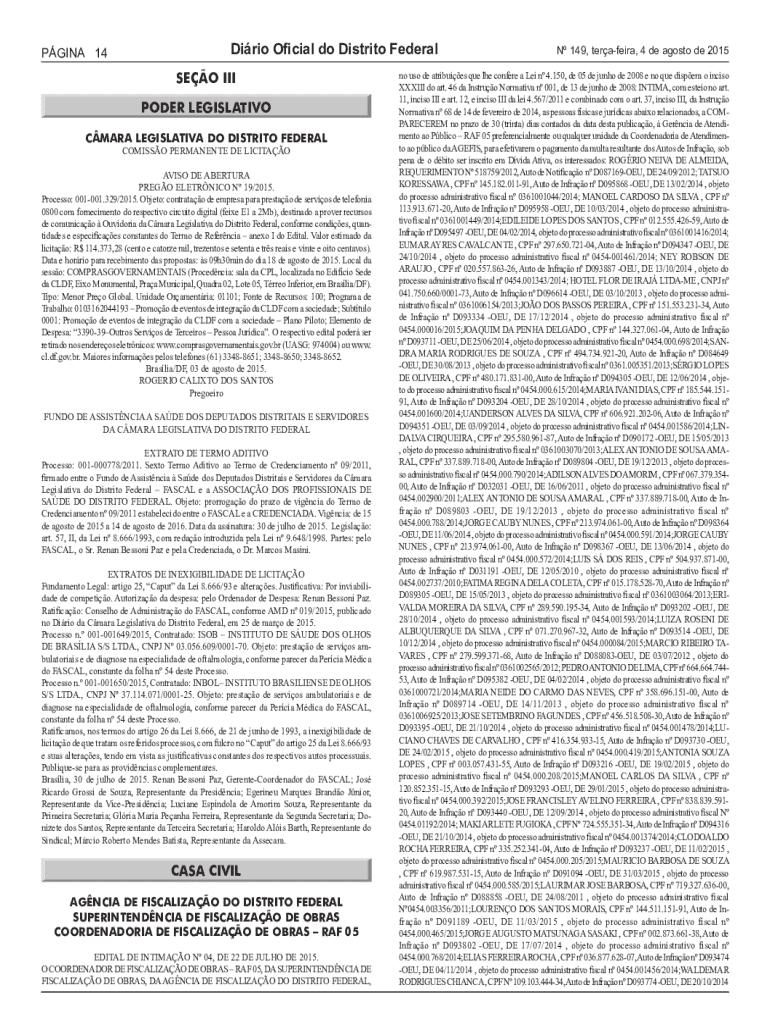 PGINA 14Dirio Oficial do Distrito Federal SEO III PODER LEGISLATIVOCMARA LEGISLATIVA DO DISTRITO FEDERAL COMISSO PERMANENTE DE LICITAOAVISO DE ABERTURA PREGO ELETRNICO N 19/2015. Processo: 001001.329/2015.