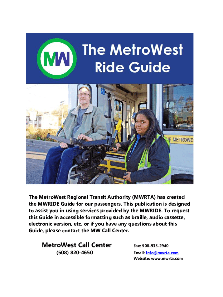 The MetroWest Regional Transit Authority (MWRTA) has created the MWRIDE Guide for our passengers. This publication is designed to assist you in using services provided by the MWRIDE. To request this