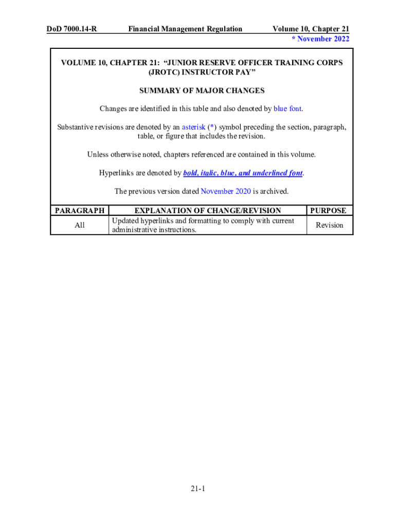 DoD 7000.14RFinancial Management Regulation2BVolume 10, Chapter 21 * November 2022VOLUME 10, CHAPTER 21: JUNIOR RESERVE OFFICER TRAINING CORPS (JROTC) INSTRUCTOR PAY SUMMARY OF MAJOR CHANGES Changes