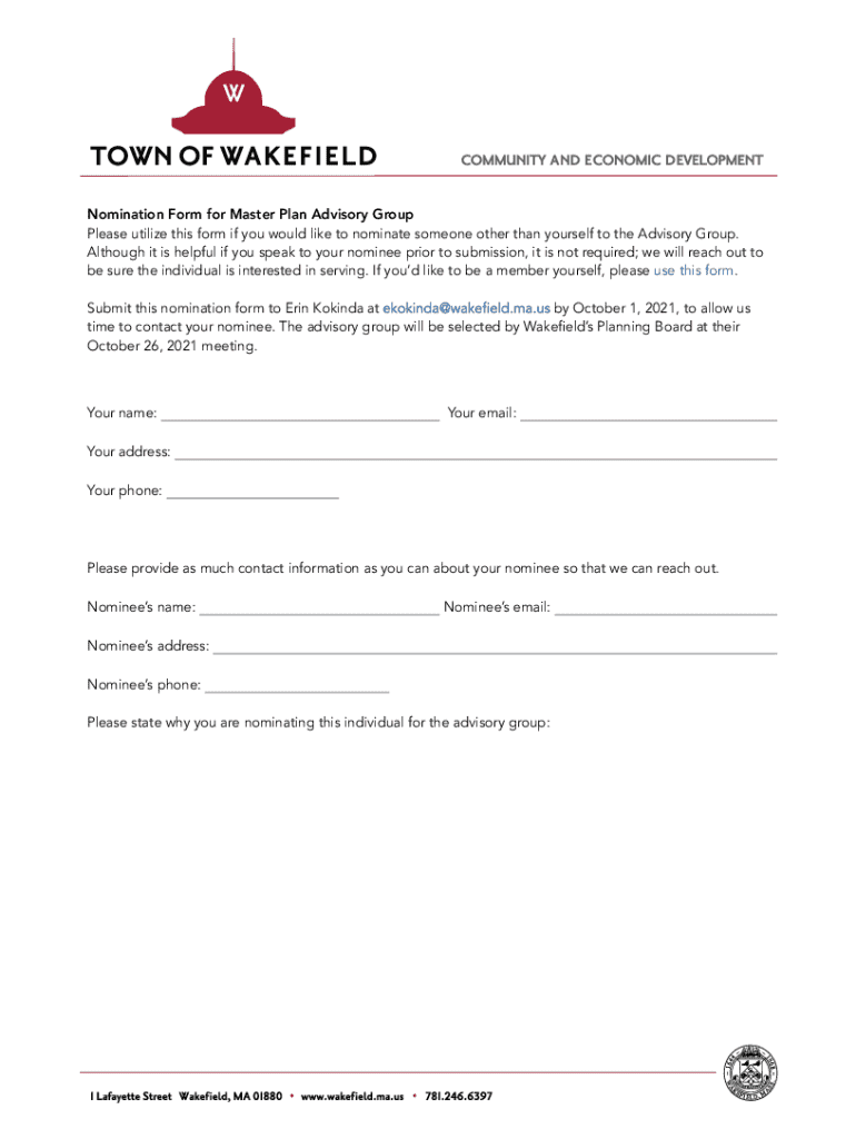 Get the free Nomination Form for Master Plan Advisory GroupWakefield, MA