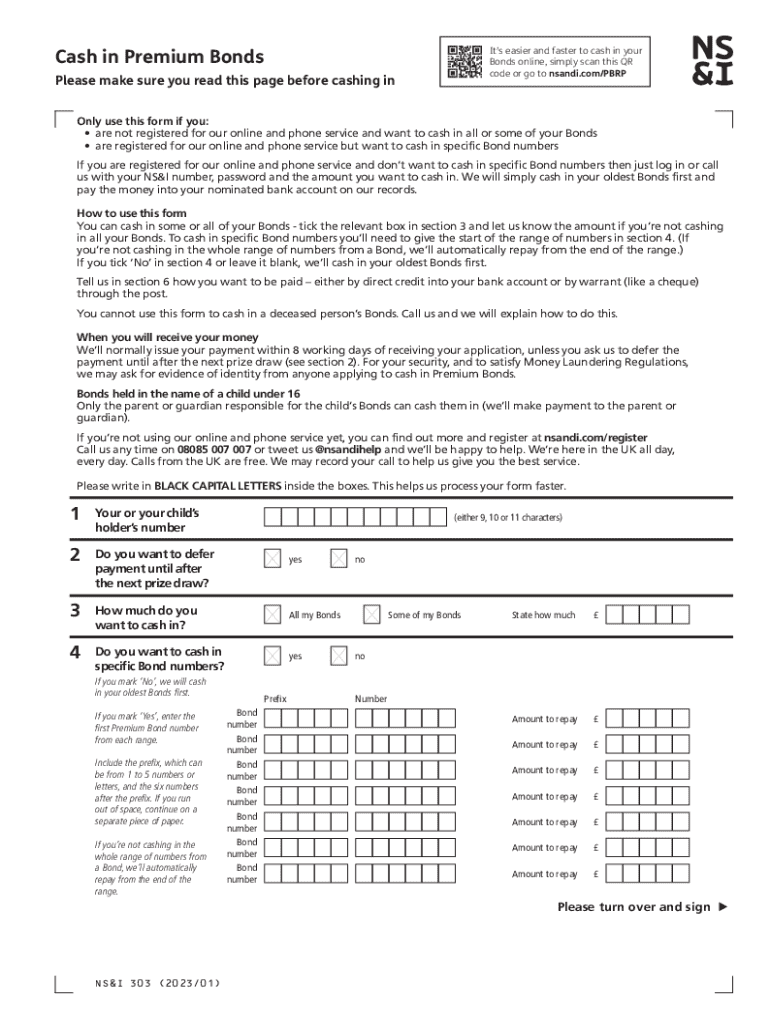 Cash in Premium BondsIts easier and faster to cash in your Bonds online, simply scan this QR code or go to nsandi.com/PBRPPlease make sure you read this page before cashing inOnly use this form if