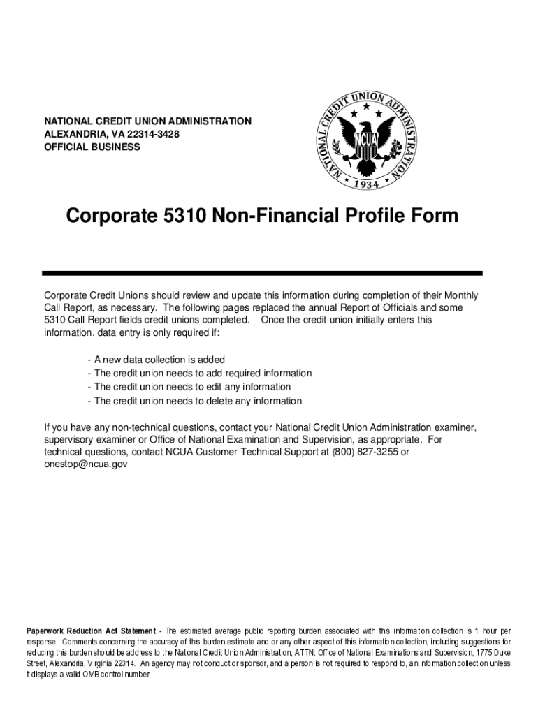 This form is for corporate credit unions to report and update their non-financial profile as part of the Monthly Call Report to the National Credit Union Administration (NCUA). It includes certifications regarding senior management changes, minimum security devices, and collects general, regulatory, and service-related information.
