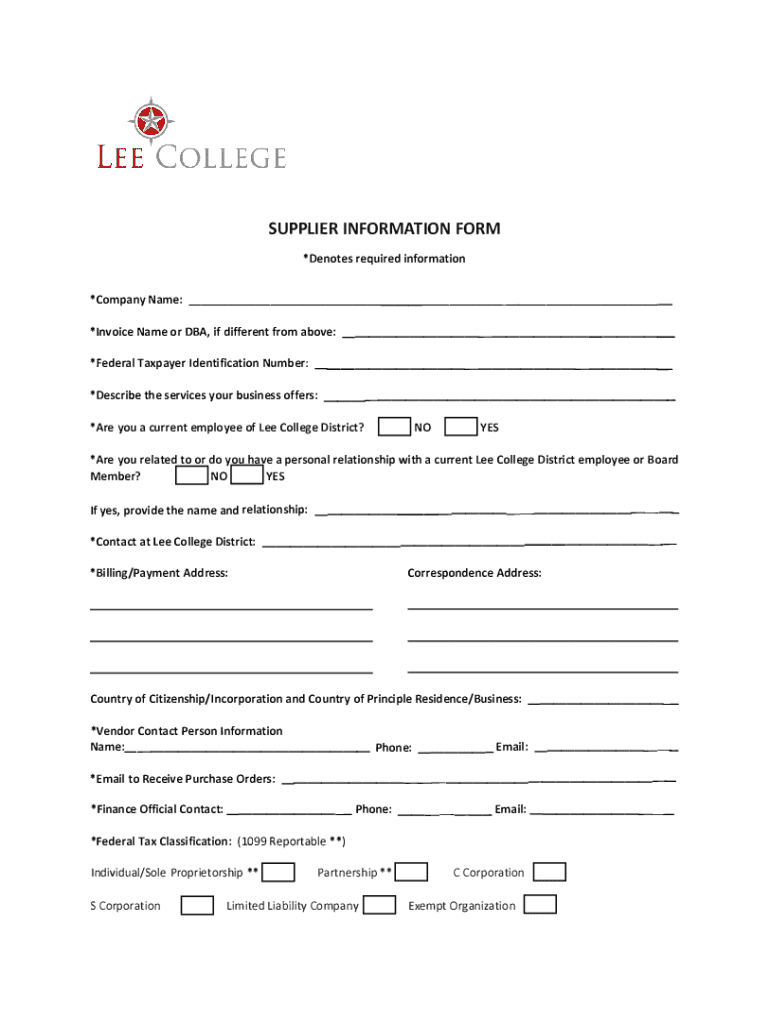 This document contains a New Supplier Packet necessary for vendors wishing to register with Lee College. It includes required forms such as Supplier Information Request, W-9 for Taxpayer Identification, and a Conflict of Interest Questionnaire. Suppliers must complete all required documents to be listed in the college\'s accounting system.