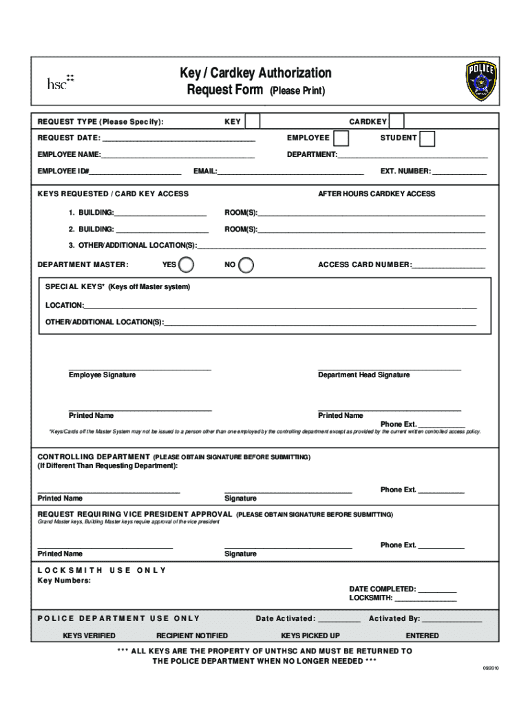 Key / Cardkey Authorization Request Form (Please Print) REQUEST TYPE (Please Specify):KEYCARDKEYREQUEST DATE: ___EMPLOYEEEMPLOYEE NAME:___DEPARTMENT:___EMPLOYEE ID#___STUDENTEMAIL:___KEYS REQUESTED