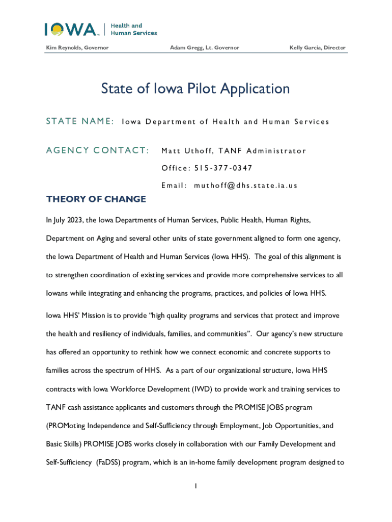 Kim Reynolds, GovernorAdam Gregg, Lt. GovernorKelly Garcia, DirectorState of Iowa Pilot Application STATE NAME: Iowa Department of Health and Human Services AGENCY CONTACT:Matt Uthoff, TANF Administrator