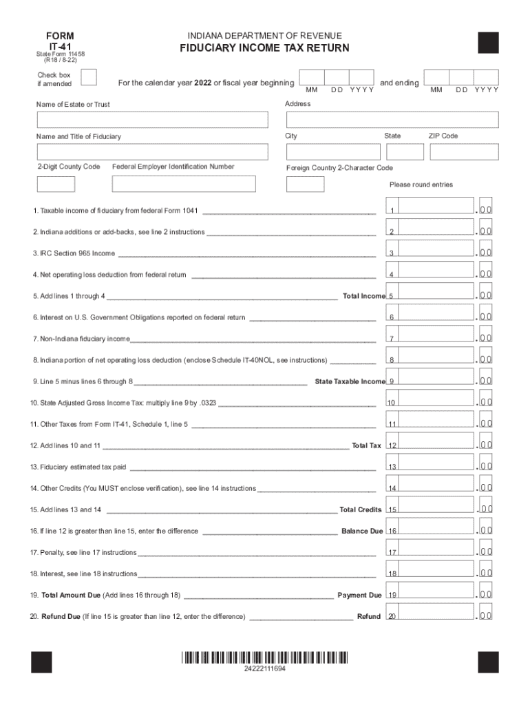 This form is used by fiduciaries to report the income, deductions, and tax liabilities of estates or trusts in Indiana for the taxable year. The return includes lines for reporting income, adjustments, tax due, and credits related to fiduciary income. It also requires information on beneficiaries, including any nonresident beneficiaries, and specific details surrounding the fiduciary\'s identity and tax obligations.