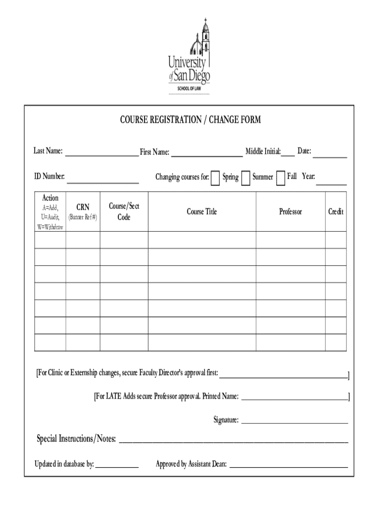 COURSE REGISTRATION / CHANGE FORM Last Name: ID Number: Action AAdd, UAudit, WWithdrawChanging courses for: CRN (Banner Ref #)Course/Sect CodeDate:Middle Initial:First Name: SpringCourse Title[For