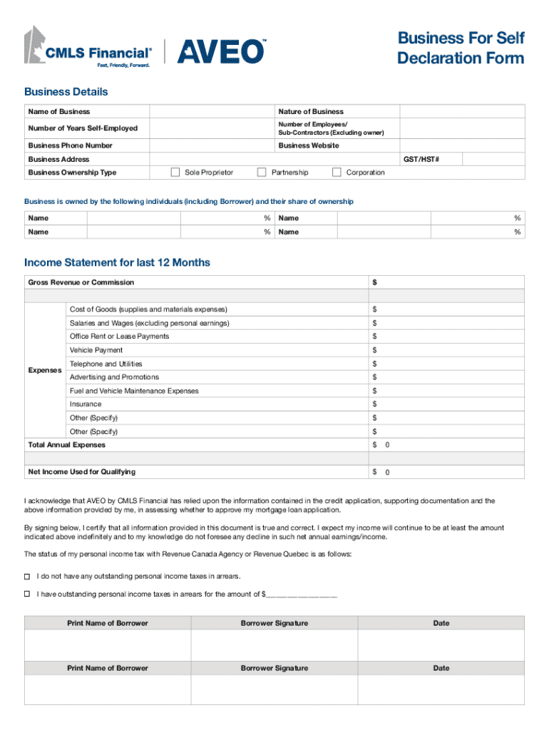 Business For Self Declaration Form Business Details Name of BusinessNature of BusinessNumber of Years SelfEmployedNumber of Employees/ SubContractors (Excluding owner)Business Phone NumberBusiness