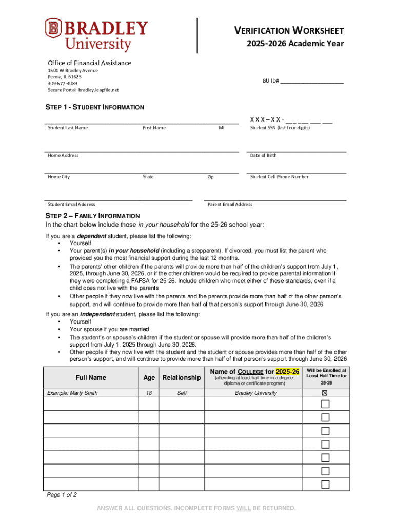 VERIFICATION WORKSHEET 20252026 Academic Year Office of Financial Assistance 1501 W Bradley Avenue Peoria, IL 61625 3096773089 Secure Portal: bradley.leapfile.netBU ID# ___STEP 1 STUDENT INFORMATION