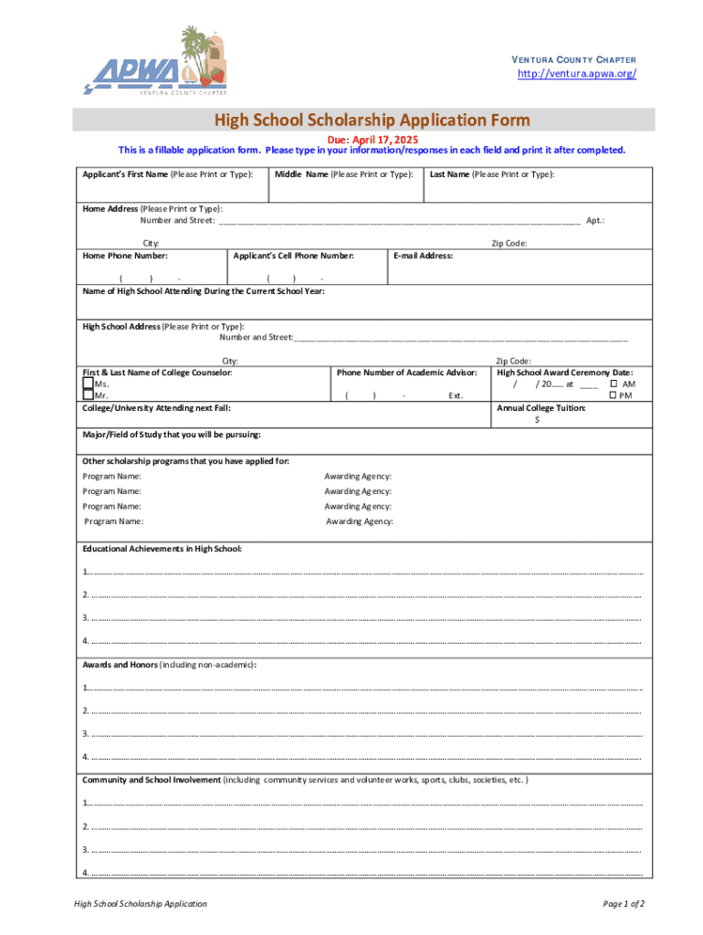 This is a fillable application form for high school students applying for a scholarship through the Ventura County Chapter. The application requires personal information, academic achievements, involvement in community service, and a description of interest in the field of public works. Applicants must also submit supporting documents by the deadline of April 17, 2025.