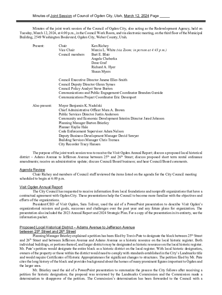 Minutes of Joint Session of Council of Ogden City, Utah, March 12, 2024 Page Minutes of the joint work session of the Council of Ogden City, also acting as the Redevelopment Agency, held on Tuesday,