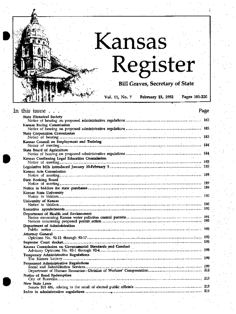 In thisissuePageState Historical Societv Notice of hearing cin proposed adminisbative Kansas Racing CommissionNotice of hearing on proposed administrative regqlations......;.......State Corporation