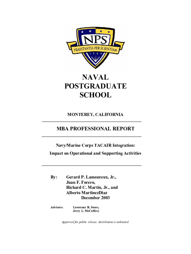 NAVAL POSTGRADUATE SCHOOL MONTEREY, CALIFORNIAMBA PROFESSIONAL REPORT Navy/Marine Corps TACAIR Integration: Impact on Operational and Supporting ActivitiesBy:Gerard P. Lamoureux, Jr., Juan F. Forero,
