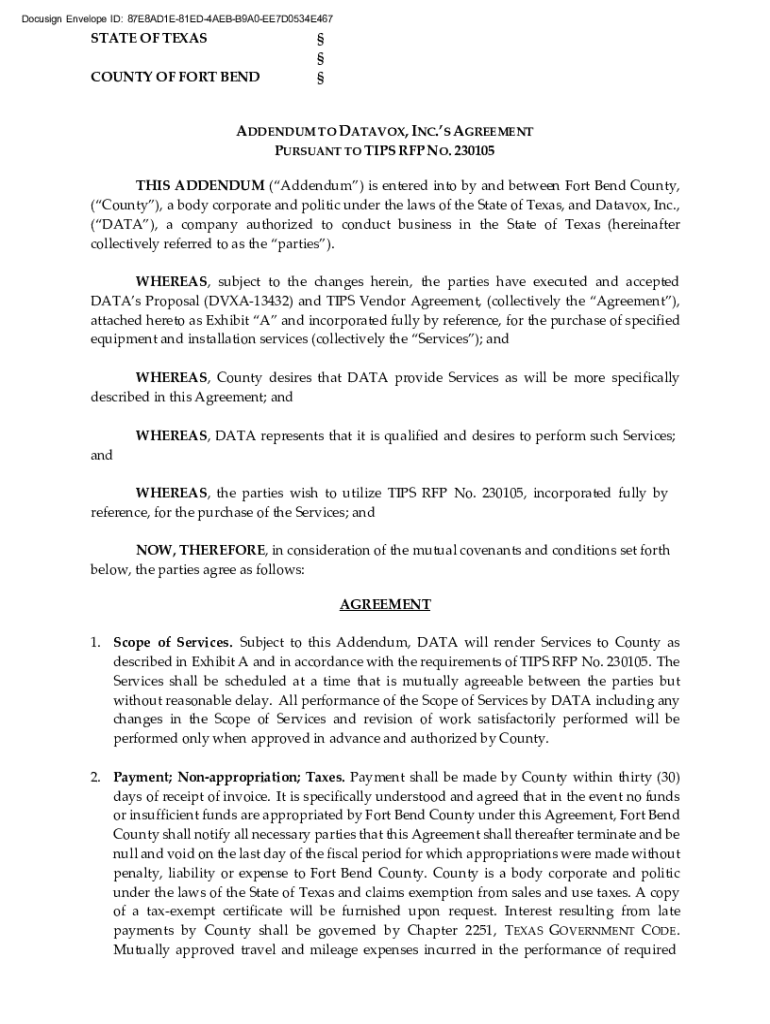 Docusign Envelope ID: 87E8AD1E81ED4AEBB9A0EE7D0534E467STATE OF TEXAS COUNTY OF FORT BEND ADDENDUM TO DATAVOX, INC.S AGREEMENT PURSUANT TO TIPS RFP NO. 230105 THIS ADDENDUM (Addendum) is entered into
