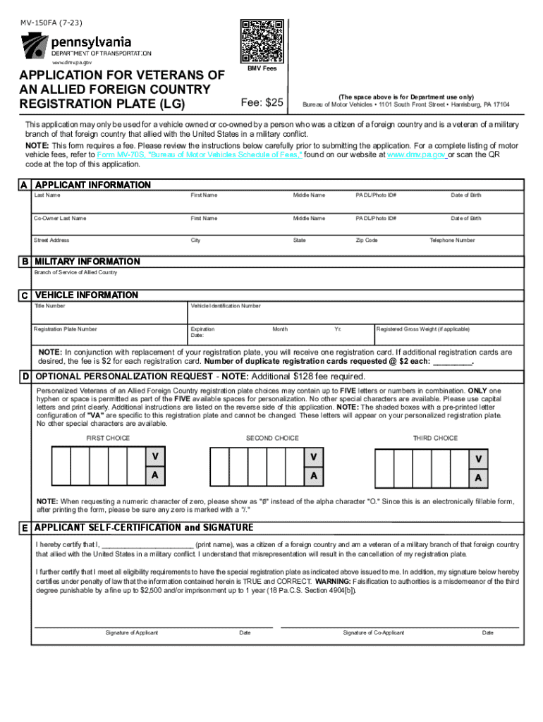 MV150FA (723)www.dmv.pa.govAPPLICATION FOR VETERANS OF AN ALLIED FOREIGN COUNTRY REGISTRATION PLATE (LG)BMV Fees(The space above is for Department use only) Bureau of Motor Vehicles 1101 South Front