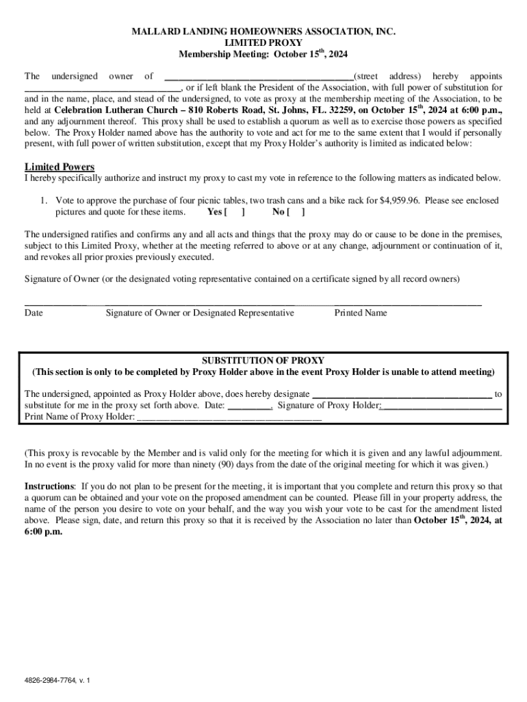MALLARD LANDING HOMEOWNERS ASSOCIATION, INC. LIMITED PROXY Membership Meeting: October 15th, 2024 The undersigned owner of ___(street address) hereby appoints ___, or if left blank the President of