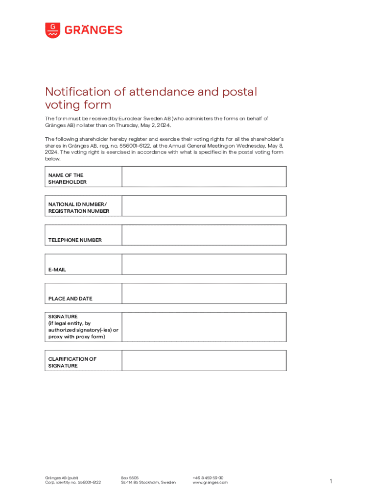 This form is used by shareholders of Gränges AB to register their attendance and exercise their voting rights by postal voting for the Annual General Meeting scheduled for May 8, 2024.