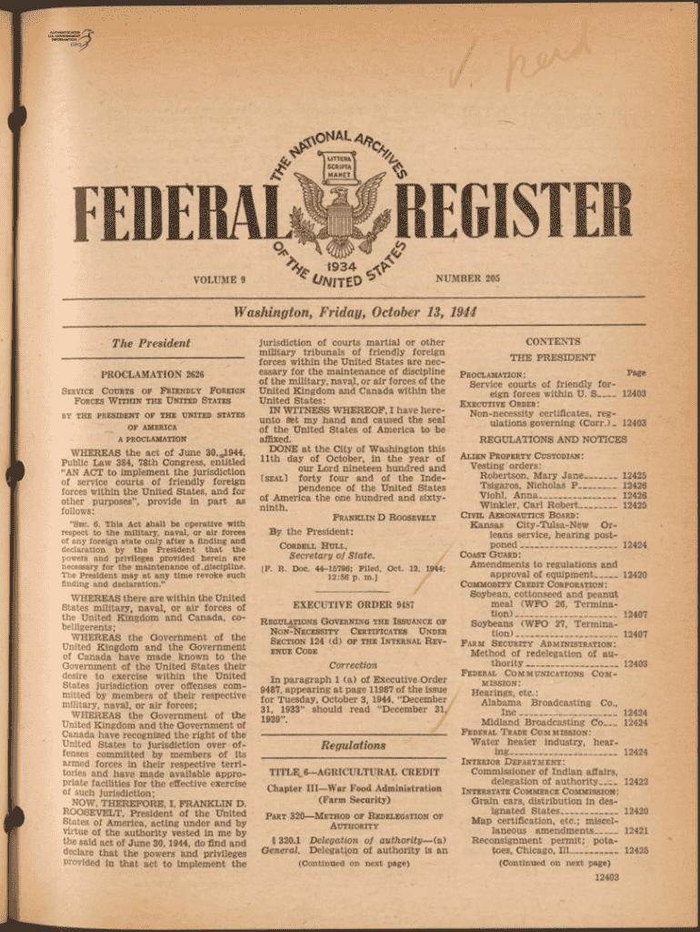 REGISTERFEDERAL \'S * .1934^/A/it ED ^VOLUME 9NUMBER 205Washington, Friday, October 13, 1944 The President PROCLAMATION 2626 S ervice C ourts of F riendly F oreign F orces W it h in the U nited S