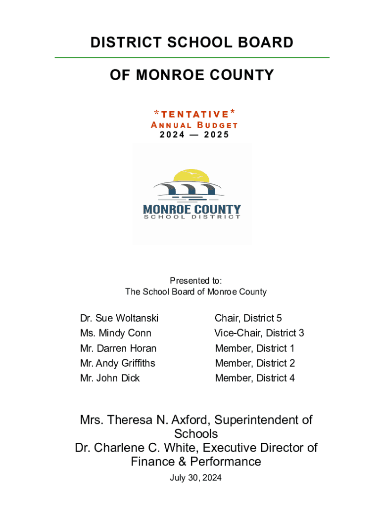 DISTRICT SCHOOL BOARD OF MONROE COUNTY * *A B 2024 2025Presented to: The School Board of Monroe CountyDr. Sue Woltanski Ms. Mindy Conn Mr. Darren Horan Mr. Andy Griffiths Mr. John DickChair, District