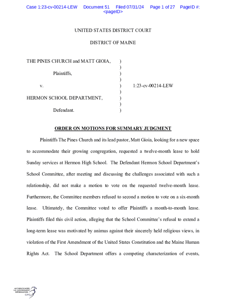 This document outlines the order regarding competing motions for summary judgment between The Pines Church and the Hermon School Department. The court analyzes the requests for long-term leasing of facilities for religious services, addressing allegations of discrimination based on religious beliefs in violation of constitutional rights.