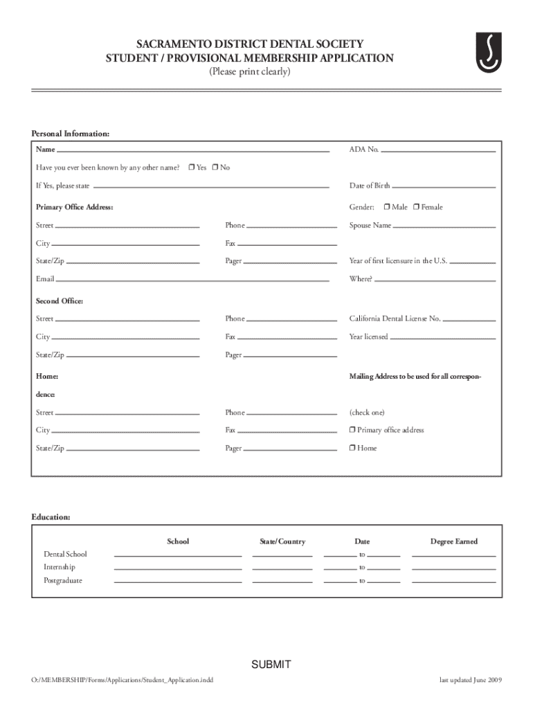 Application form for student or provisional membership in the Sacramento District Dental Society, collecting personal information, education, and licensure details.
