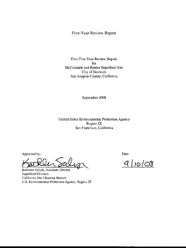 This report documents the first Five-Year Review conducted by the U.S. Environmental Protection Agency (EPA) for the McCormick and Baxter Superfund Site, assessing the protective measures taken to ensure human health and the environment are safeguarded from the remedial actions implemented at the site, focusing on sediment capping and related issues.
