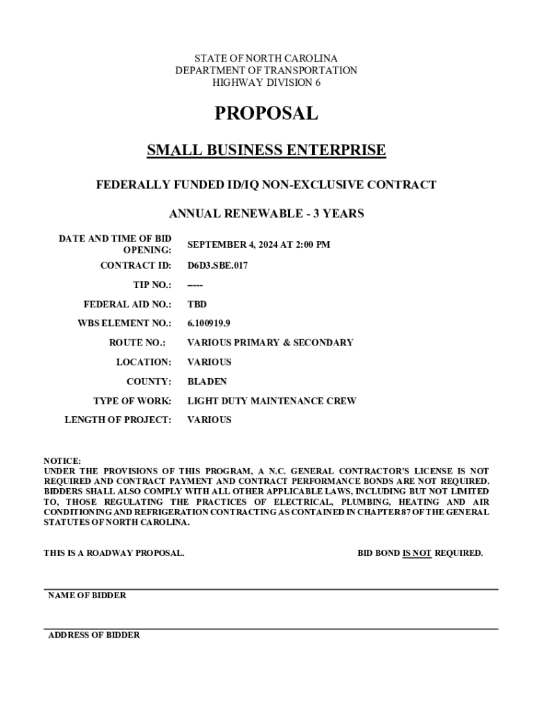 STATE OF NORTH CAROLINA DEPARTMENT OF TRANSPORTATION HIGHWAY DIVISION 6PROPOSAL SMALL BUSINESS ENTERPRISE FEDERALLY FUNDED ID/IQ NONEXCLUSIVE CONTRACT ANNUAL RENEWABLE 3 YEARS DATE AND TIME OF BID