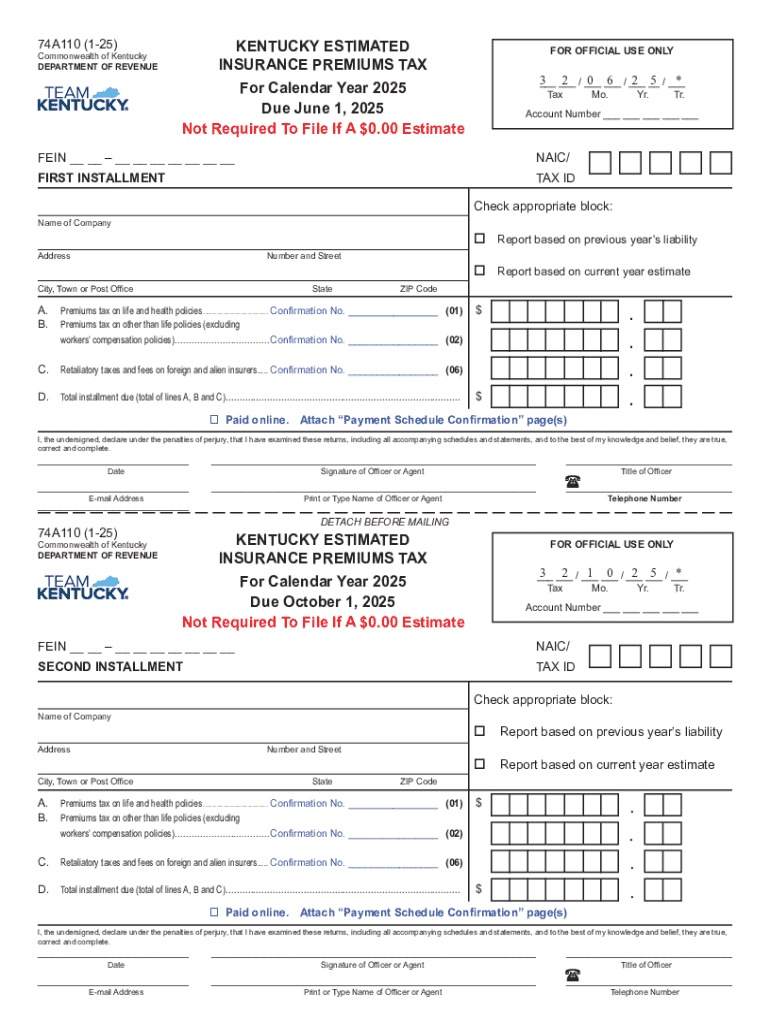 This form is used by insurance companies in Kentucky to report and submit estimated insurance premiums tax for the calendar year 2025, including instructions for filing and payment.