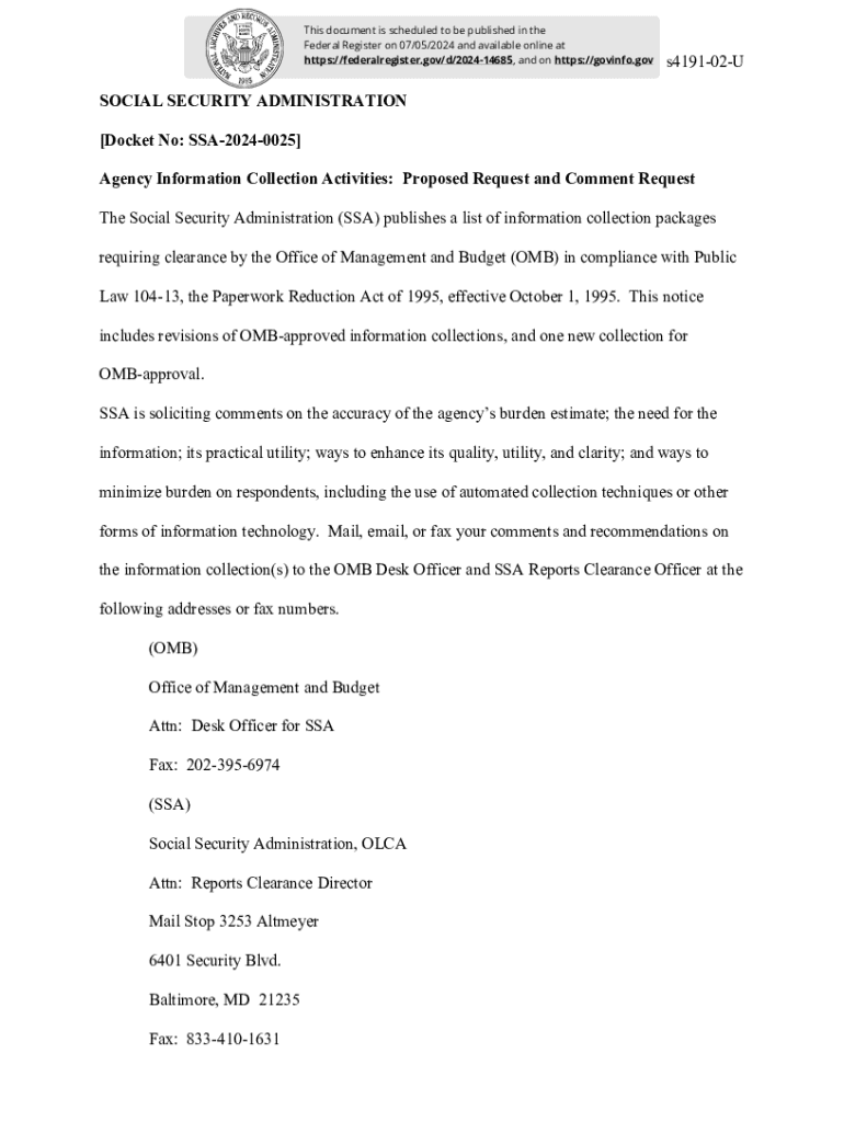 This document is scheduled to be published in the Federal Register on 07/05/2024 and available online at https://federalregister.gov/d/202414685, and on https://govinfo.govs419102USOCIAL SECURITY