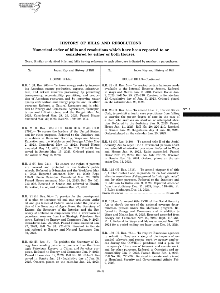HISTORY OF BILLS AND RESOLUTIONS Numerical order of bills and resolutions which have been reported to or considered by either or both Houses. NOTE. Similar or identical bills, and bills having reference