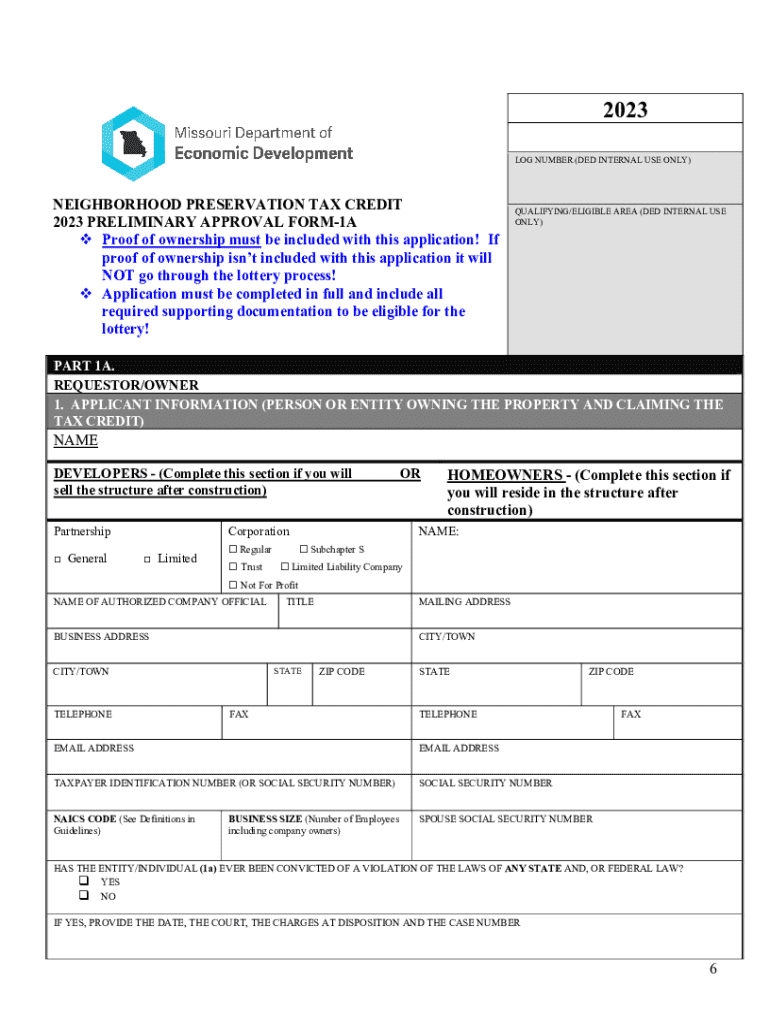 Get the free Neighborhood Preservation Tax Credit 2023 Preliminary Approval Form-1a - ded mo