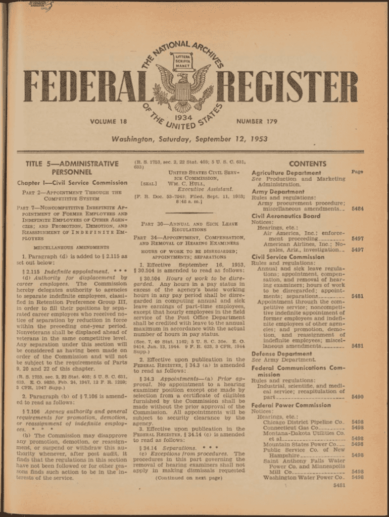 J*FEDERAL VOLUME 18REGISTER \'9 3 4 ^ * ^ N n to ^NUMBER 179Washington, Saturday, September 12, 1953TITLE 5 ADMINISTRATIVE PERSONNEL(R. S. 1753, sec. 2, 22 Stat. 403; 5 U. S. O. 631, 633) U nited
