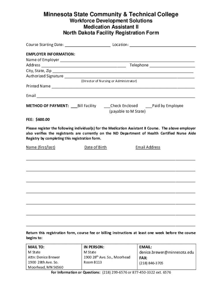 This form is used for registering individuals for the Medication Assistant II course offered by Minnesota State Community & Technical College. It includes sections for employer information, method of payment, and registrant details.