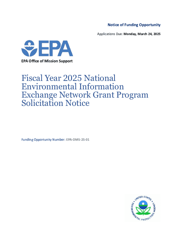 This Notice of Funding Opportunity (NOFO) outlines the essential information regarding the EPA\'s FY 2025 Environmental Information Exchange Network Grant Program, including application submission details, funding opportunities, eligibility criteria, and program descriptions for potential projects that support environmental data sharing and management.