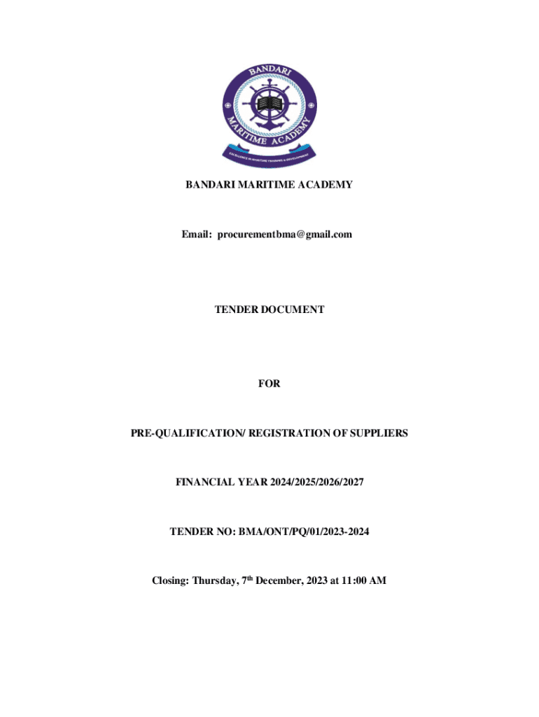 BANDARI MARITIME ACADEMYEmail: procurementbma@gmail.comTENDER DOCUMENTFORPREQUALIFICATION/ REGISTRATION OF SUPPLIERSFINANCIAL YEAR 2024/2025/2026/2027TENDER NO: BMA/ONT/PQ/01/20232024Closing: Thursday,