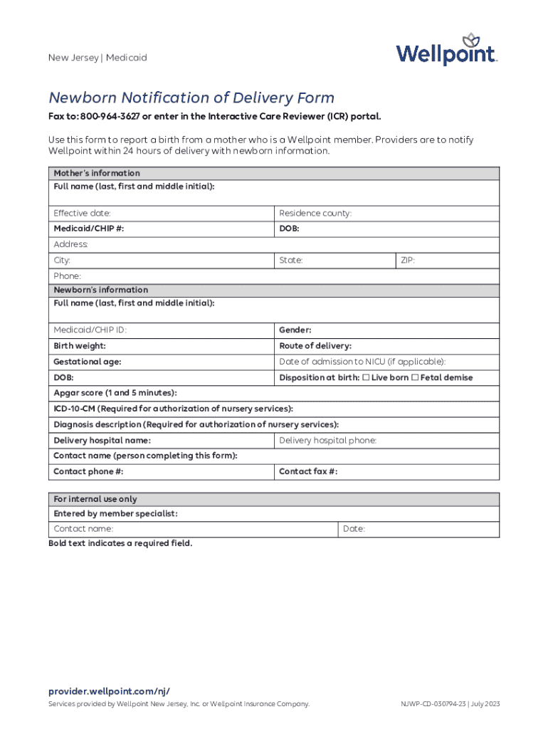 New Jersey | MedicaidNewborn Notification of Delivery Form Fax to: 8009643627 or enter in the Interactive Care Reviewer (ICR) portal. Use this form to report a birth from a mother who is a Wellpoint