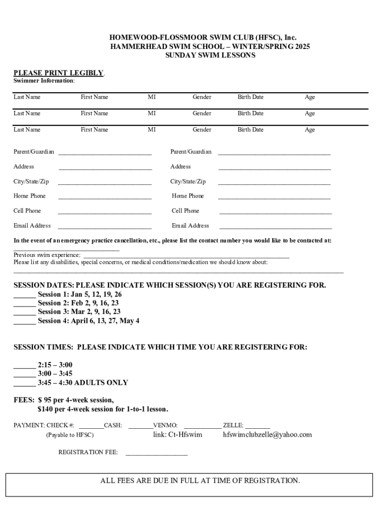 HOMEWOODFLOSSMOOR SWIM CLUB (HFSC), Inc. HAMMERHEAD SWIM SCHOOL WINTER/SPRING 2025 SUNDAY SWIM LESSONS PLEASE PRINT LEGIBLY. Swimmer Information: Last NameFirst NameMIGenderBirth DateAgeLast NameFirst