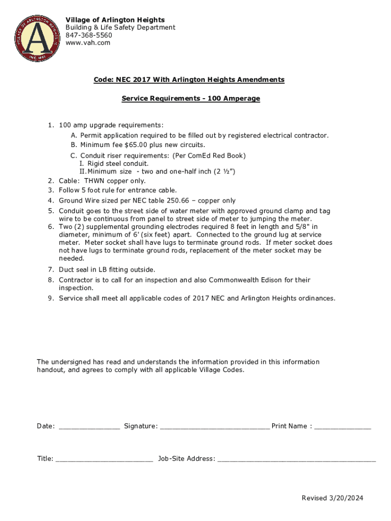 Building & Life Safety DepartmentVillage of Arlington Heights 33 S. Arlington Heights Rd. Arlington Heights, IL 60005 Phone (847) 3685560 Fax (847) 3685975 Website: www.vah.comPermit type:Electrical