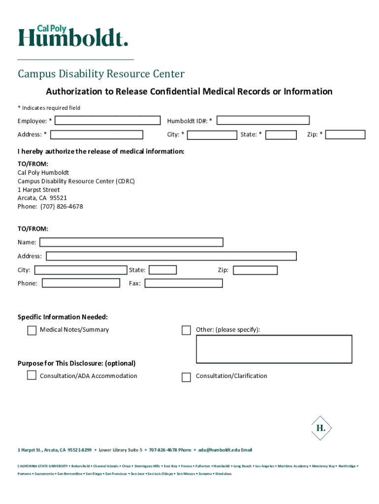 ClearPrintCampus Disability Resource CenterAuthorization to Release Confidential Medical Records or Information* Indicates required fieldEmployee: *Humboldt ID#: *Address: *City: *State: *Zip: *I