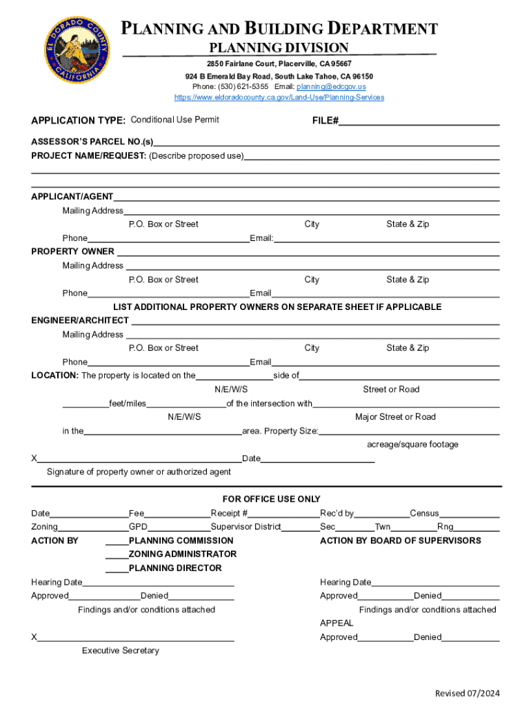 PLANNING AND BUILDING DEPARTMENT PLANNING DIVISION2850 Fairlane Court, Placerville, CA 95667 924 B Emerald Bay Road, South Lake Tahoe, CA 96150 Phone: (530) 6215355 Email: planning@edcgov.us https://www.eldoradocounty.ca.gov/LandUse/PlanningServicesAPPLICATION