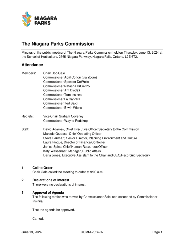The Niagara Parks Commission Minutes of the public meeting of The Niagara Parks Commission held on Thursday, June 13, 2024 at the School of Horticulture, 2565 Niagara Parkway, Niagara Falls, Ontario,