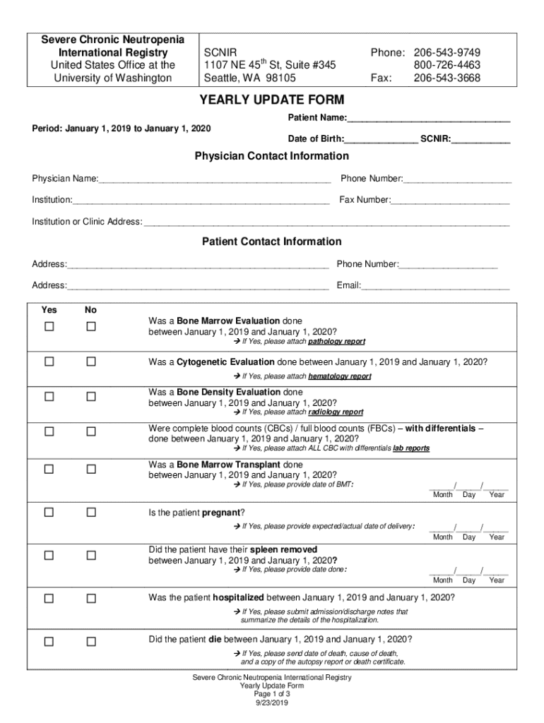 This form is designed for patients registered in the Severe Chronic Neutropenia International Registry to provide annual updates regarding their health status, treatments, and any relevant medical evaluations that have taken place during the specified period.