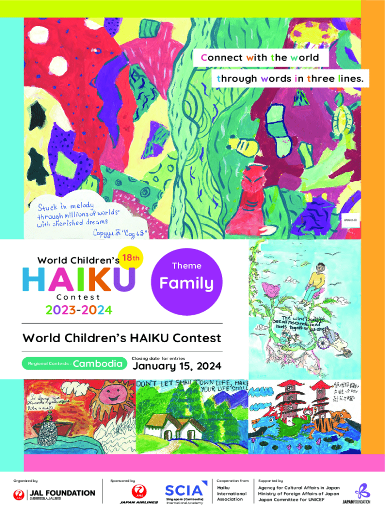 Connect with the world through words in three lines.World Childrens 18 thThemeFamilyContest20232024 World Childrens HAIKU Contest Regional Contests :Organized byClosing date for entriesCambodia January