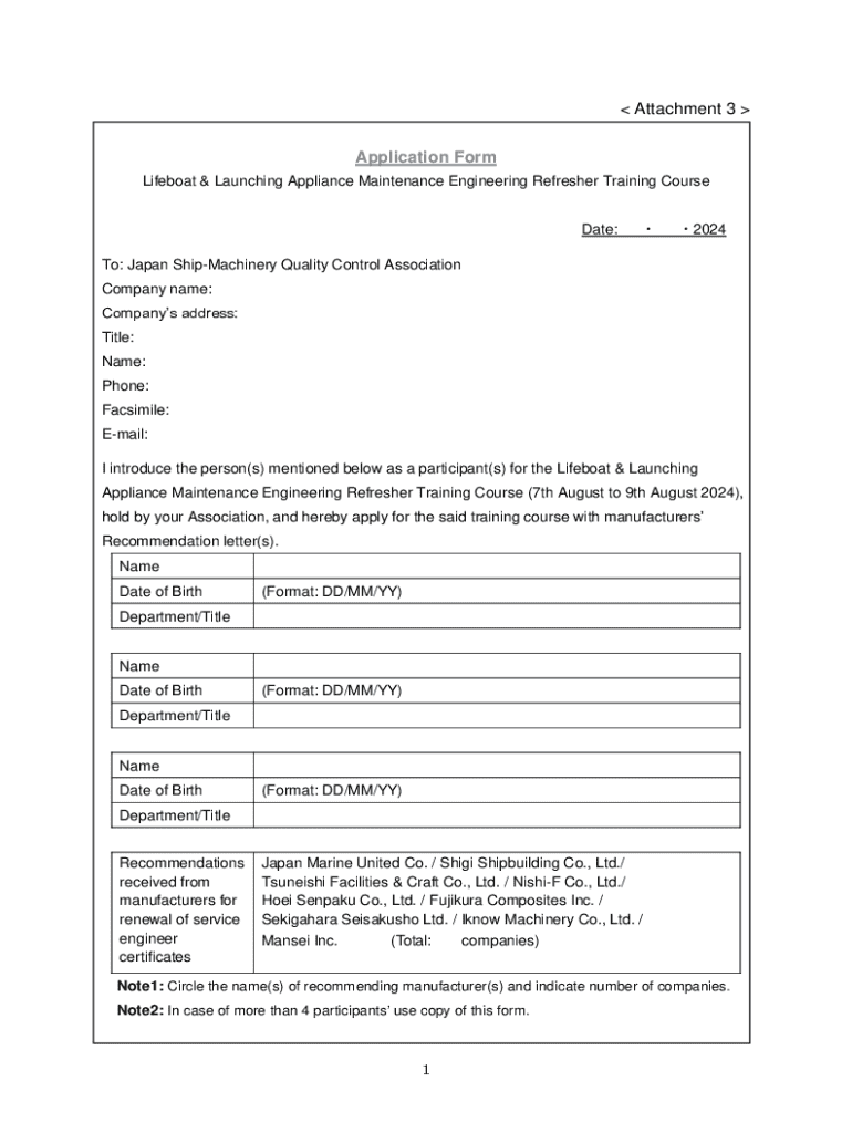 Attachment 3 Application Form Lifeboat & Launching Appliance Maintenance Engineering Refresher Training Course Date:2024To: Japan ShipMachinery Quality Control Association Company name: Companys address: