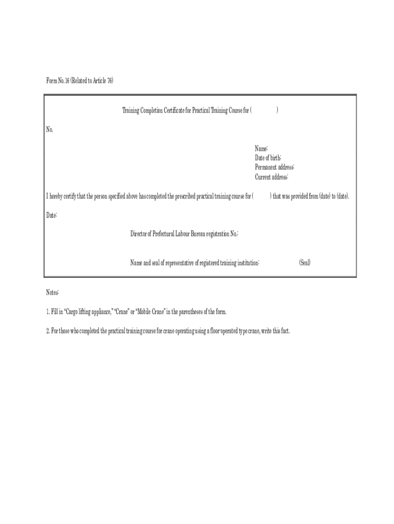 Form No.16 (Related to Article 76)Training Completion Certificate for Practical Training Course for ()No. Name: Date of birth: Permanent address: Current address: I hereby certify that the person