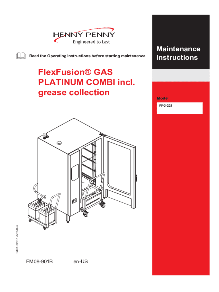 Read the Operating instructions before starting maintenanceFlexFusion GAS PLATINUM COMBI incl. grease collectionMaintenance InstructionsModelFM08901B 2/22/2024FPG221FM08901BenUSHenny Penny Corporation