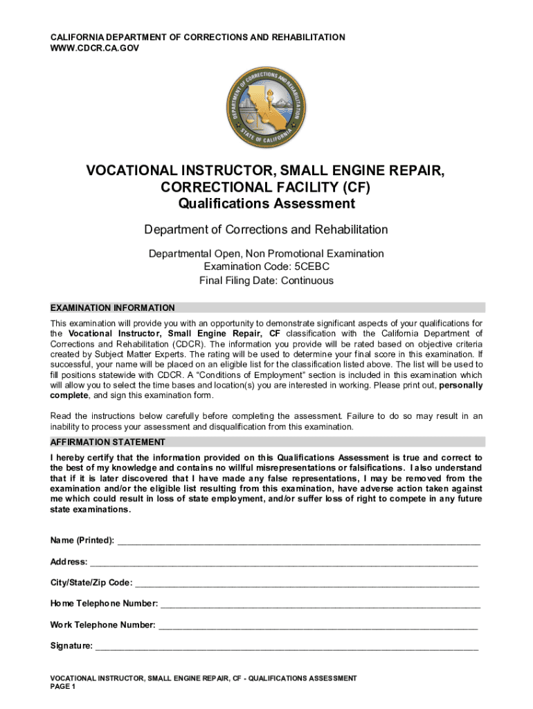 Este documento proporciona una oportunidad para demostrar aspectos significativos de sus calificaciones para la clasificación de Instructor Vocacional de Reparación de Pequeños Motores en el Departamento de Correcciones y Rehabilitación de California. La información proporcionada será evaluada según criterios objetivos y se utilizará para determinar su puntaje final en este examen.