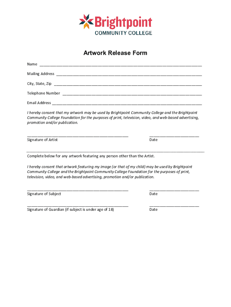 Artwork Release Form Name ___ Mailing Address ___ City, State, Zip ___ Telephone Number ___ Email Address ___ I hereby consent that my artwork may be used by Brightpoint Community College and the