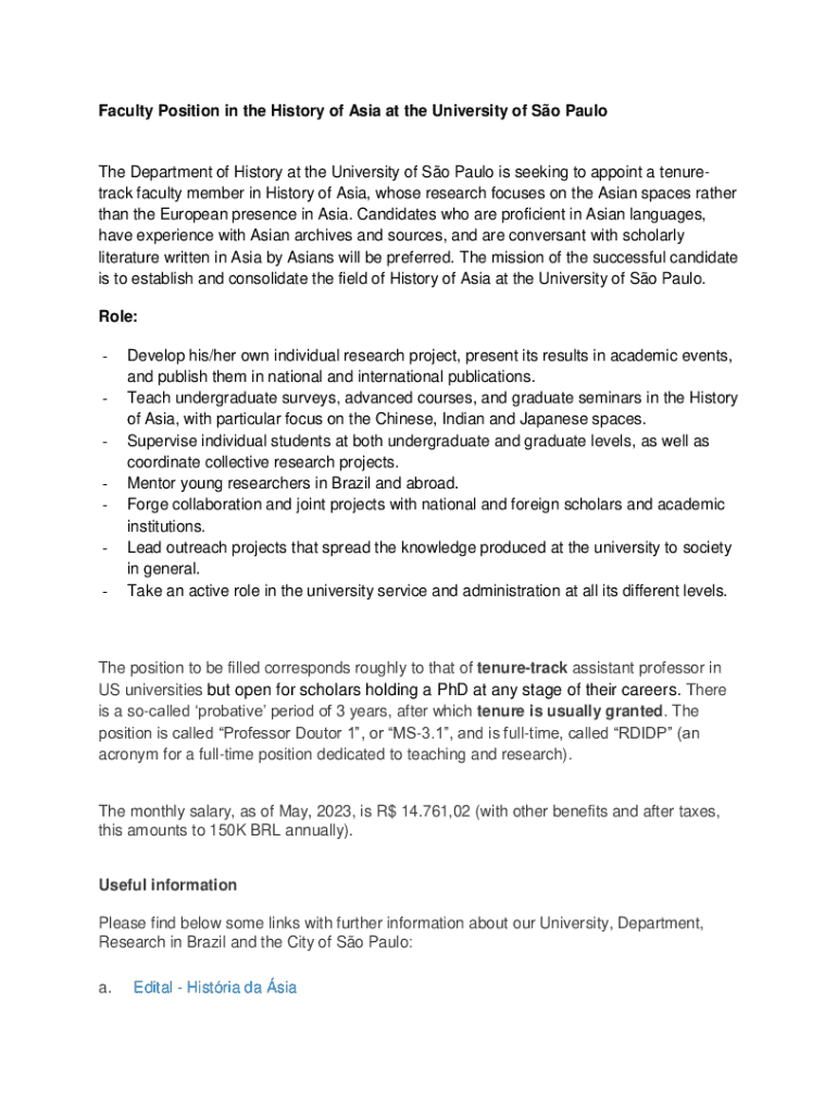 The Department of History at the University of São Paulo is seeking to appoint a tenure-track faculty member specializing in the History of Asia, focusing on Asian spaces, languages, archives, and scholarly literature. The role includes developing research, teaching, supervising students, and leading outreach projects.