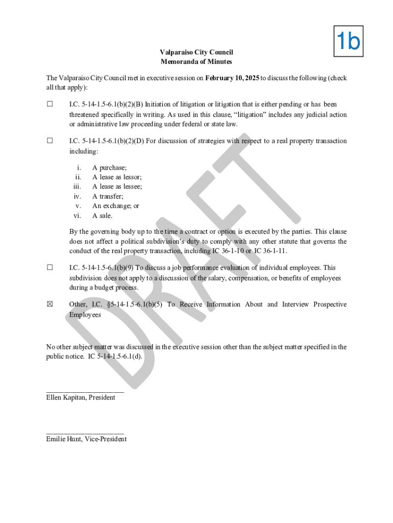 Valparaiso City Council Memoranda of Minutes1bThe Valparaiso City Council met in executive session on February 10, 2025 to discuss the following (check all that apply): I.C. 5141.56.1(b)(2)(B) Initiation
